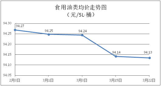 食用油类商品价格基本平稳。所监测的食用油(5L装)商品价格波动情况为1涨1跌7平,综合零售均价为每桶94.13元,环比下降0.01%。其中:鲁花花生油、金龙鱼调和油零售均价分别为每桶155.97元、70.32元,环比分别持平、下降0.13%。