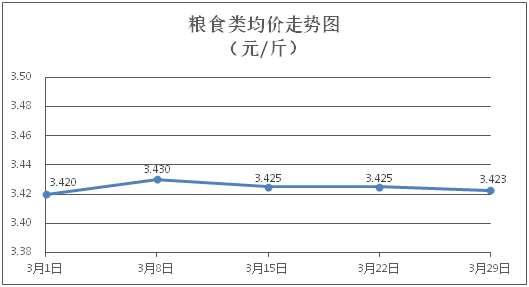 粮食类商品价格基本平稳。所监测的粮食类商品价格波动情况为1跌3平,综合零售均价为每斤3.423元,环比下降0.07%。其中:丝苗米、面粉零售均价分别为每斤3.56元、3.42元,环比分别持平、下降0.29%。