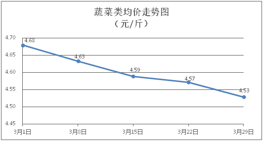 据本市21家农贸市场监测数据显示,上周(3月23日至3月29日)市场上各类“菜篮子”商品供应充足,所监测的7大类“菜篮子”商品价格与上周相比(环比)总体表现为2涨5跌。其中:粮油类商品价格稳中微降,肉类、水果类商品价格有所上涨,禽蛋类、蔬菜类、水产类商品价格总体略降。