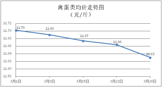 禽蛋类商品价格微幅下降。所监测的禽蛋类商品价格波动情况为1涨3跌1平,综合零售均价为每斤11.63元,环比下降0.29%。其中:白条鸡、白条鸭零售均价分别为每斤21.19元、15.11元,环比分别上涨0.09%、下降0.53%;鸡蛋、咸鸭蛋零售均价分别为每斤6.18元、8.68元,环比分别下降0.96%、下降0.57%。