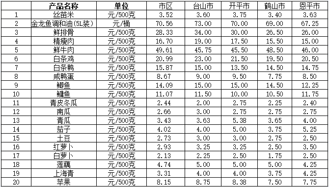 说明:1、表中价格为该地区监测点上周综合平均价;2、“市区”含蓬江区、江海区、新会区,价格分别采自蓬江市场、江南市场、城东市场等13家农贸市场;3、其他四个县市价格分别采自新华市场、锦江市场等8家农贸市场。