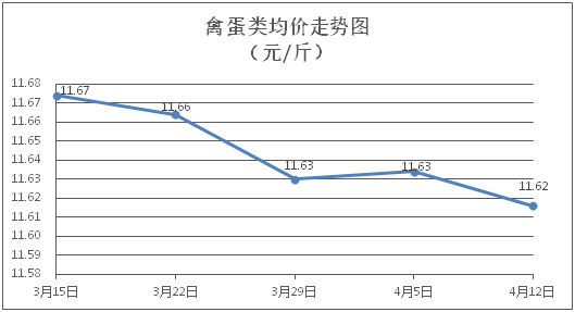 禽蛋类商品价格窄幅盘整。所监测的禽蛋类商品价格波动情况为2涨2跌1平,综合零售均价为每斤11.62元,环比下降0.15%。其中:白条鸡、白条鸭零售均价分别为每斤21.07元、15.05元,环比分别下降0.47%、下降0.40%;鸡蛋、咸鸭蛋零售均价分别为每斤6.25元、8.68元,环比分别上涨0.81%、持平。