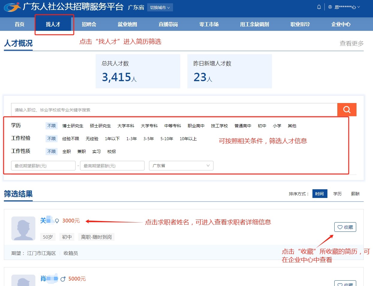 1.选择“找人才”模块,查看求职者简历,可点击求职者姓名查看详细简历信息。