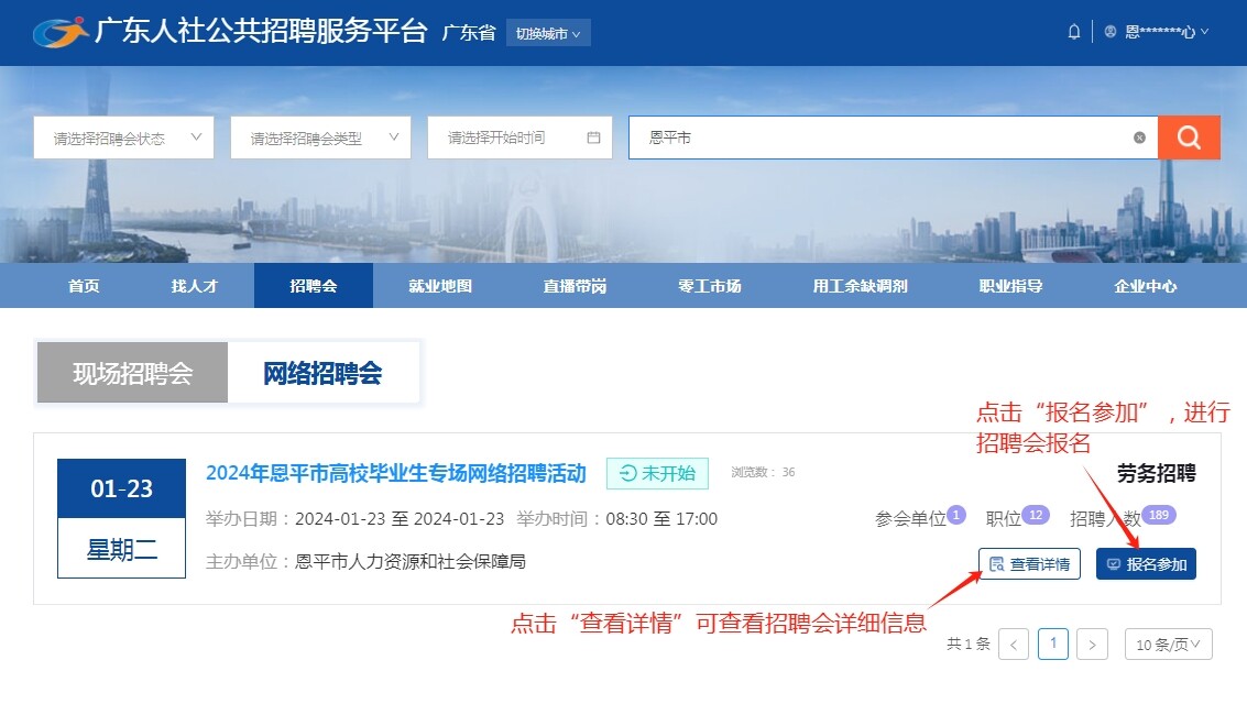 2.点击“查看详情”可进入查看招聘会具体信息,点击“报名参加”进入招聘会报名程序。