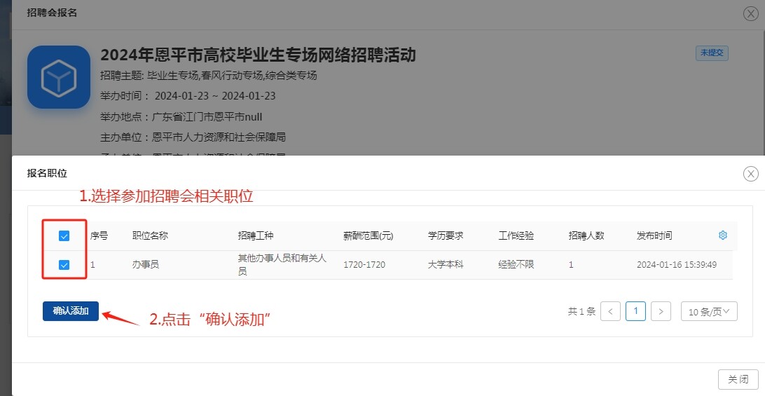 3.招聘会报名:点击“报名参加”,需添加职位信息,添加后确认报名。