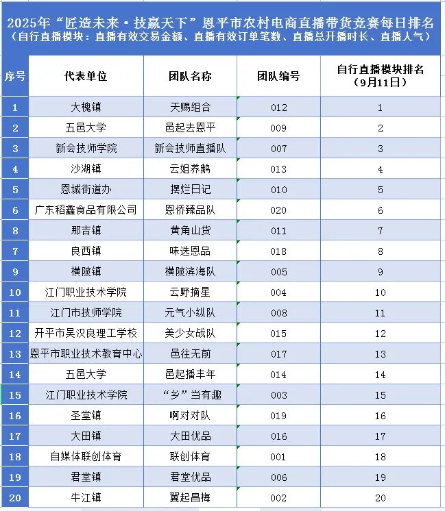 9月11日,2025年“恩平优品杯”农村电商线上直播带货团队竞赛火热开赛!本次赛事由恩平市人力资源和社会保障局、恩平市总工会、恩平市资产管理委员会办公室联合主办,共有20支参赛队伍同台竞技。在自主直播赛段中,从8人协作的“王牌战队”到单枪匹马的“独行侠”,各队伍纷纷亮出看家本领,以产品讲解、福利互动等多样形式,全力为恩平名优产品带货引流。