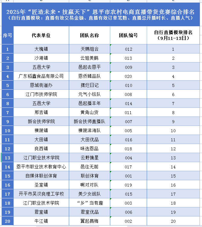 经过9月11-13日的比拼,来自恩平大槐镇的天赐组合凭借亮眼的销售数据与超高直播间热度继续斩获冠军,来自沙湖镇的云姐养鹅队、来自五邑大学的邑起去恩平队紧追不舍,分获第二、三名。