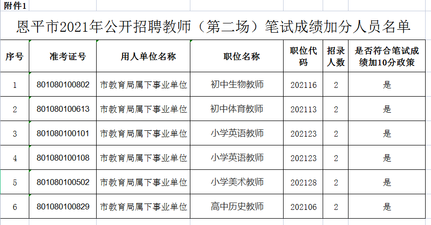根据《关于“三支一扶”服务计划高校毕业生参加我市事业单位公开招聘实行加分政策的通知》(江人社发〔2020〕106号)和《恩平市2021年公开招聘教师公告(第二场)》精神,在恩平市2021年公开招聘教师(第二场)笔试前资格审核中,我局对考生提交的笔试加分材料进行了审核。经审核,共有6人符合“笔试加分”政策。现对审核通过人员名单予以公示,公示时间从2021年7月30日至2021年8月3日止。