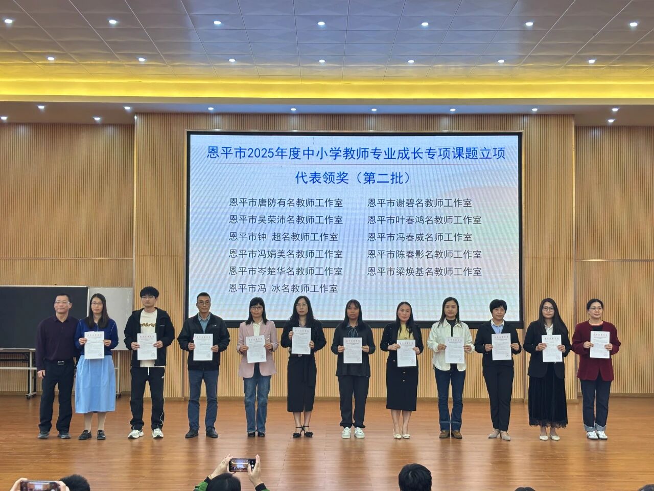 活动伊始,恩平市教师发展中心副主任卢惠贤为21个立项的市级中小学教师专业成长专项课题工作室代表颁发立项证明,并就课题研究工作给予指导,为教师科研指明方向。