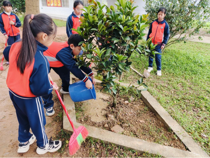 横陂镇中心小学则将植树护绿与特色劳动教育结合,亮点纷呈。植树节当天,学校组织党员教师与少先队员代表走进劳动教育实践基地,共植柠檬树、番石榴树,党队携手种下“希望苗”;同时,学校秋季启动的圣女果种植劳动实践也迎来丰收,学生亲历育种、管护、采摘全周期,在田间劳作和班级绿植角管护中习得技能,真切体会“一分耕耘一分收获”的内涵,让劳动教育既有烟火气,更有育人实效。