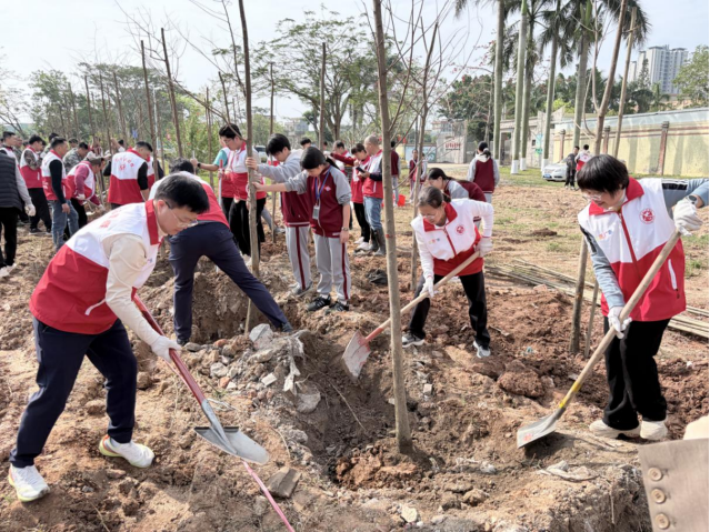 东成中学、牛江镇中心小学以校园植绿为抓手,组织学生开展义务植树活动。老师现场讲解栽植、养护技巧,同学们分工协作、干劲十足,挥锹铲土、扶苗固根、提水浇灌,一道道工序有条不紊,新栽的树苗在春风中挺立,为校园增添盎然生机。圣堂镇则在圣堂中学开展乡村绿化启动仪式暨植树节活动,市政协领导、镇村干部与师生代表共同栽种80棵落羽杉,专业专家现场指导栽种技巧,政企校协同为校园周边添绿,让绿色理念在实践中扎根。