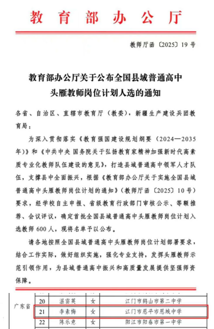 近日,教育部办公厅印发《关于公布全国县域普通高中头雁教师岗位计划人选的通知》,正式确定首批全国县域普通高中头雁教师岗位计划入选教师600名。其中,我市恩城中学高中语文正高级教师李素梅成功入选。