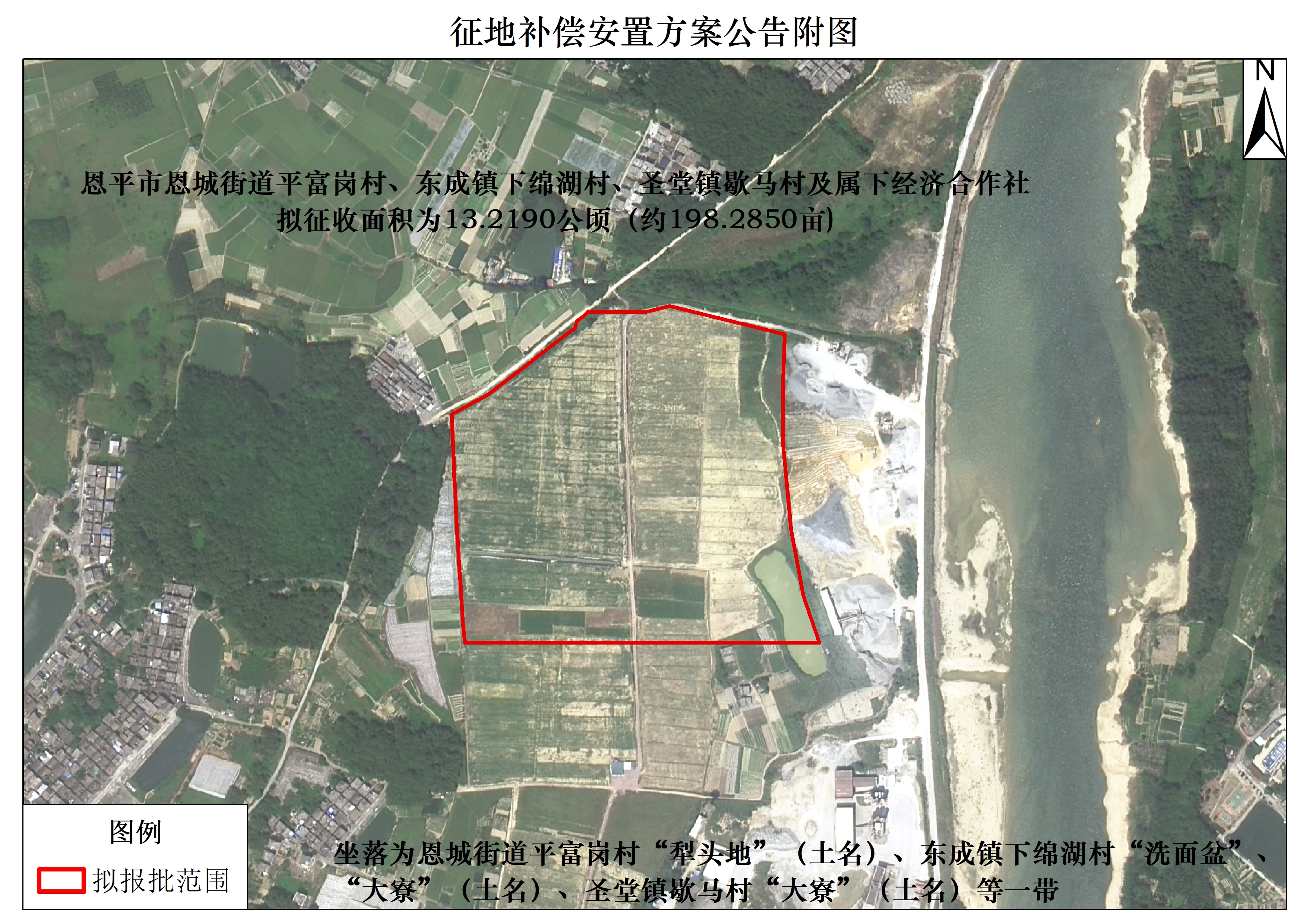 拟征收土地位于恩城街道平富岗村“犁头地”(土名)、东成镇下绵湖村“洗面盆”、“大寮”(土名)、圣堂镇歇马村“大寮”(土名)等一带地段范围内,具体位置详见附图。