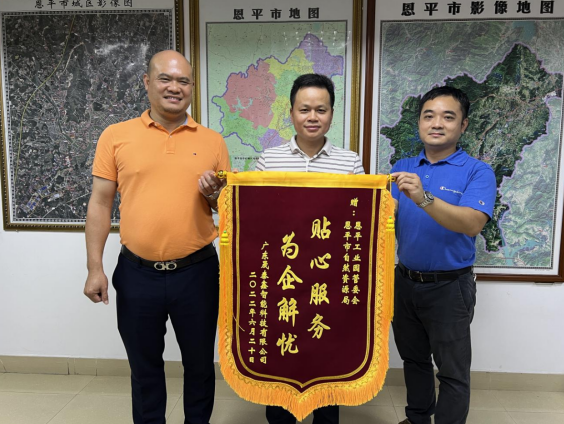 “贴心服务,为企解困”6月20日,广东晟泰鑫智能科技有限公司总经理戴贵阳特意向恩平市工业园区管委会、恩平市自然资源局送上锦旗,感谢双方部门为企业解困。