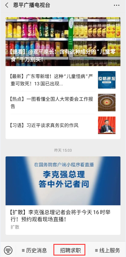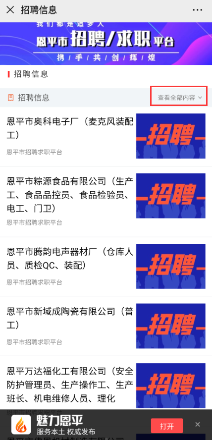 二、点击“招聘求职”专栏,查阅恩平市最新招聘信息(点击“查看全部内容”)、求职登记。
