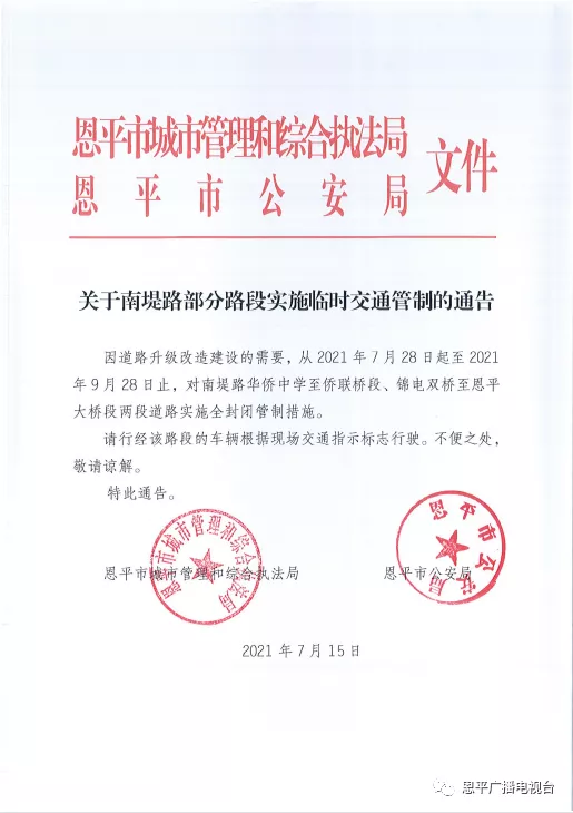 因道路升级改造建设的需要,从2021年7月28日起至2021年9月28日止,对南堤路华侨中学至侨联桥段、锦电双桥至恩平大桥段两段道路实施全封闭管制措施。