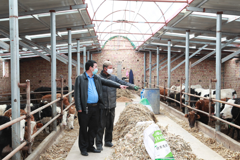 在甘肃省临夏回族自治州广河县庄窠集镇西坪村,全国人大代表马天龙(左)和养牛户马志德讨论养殖问题(3月10日摄)。新华社发(杜哲宇 摄)