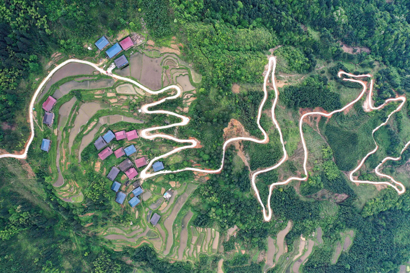 这是广西融水苗族自治县同练瑶族乡大坪村下大弄屯的通屯公路(无人机照片,5月12日摄)。2016年至2019年,同练瑶族乡共建设48条公路,实现108个屯全部通路、49个20户以上屯全部通水泥路,改善了瑶乡群众的出行条件,打通了脱贫攻坚“最后一公里”。新华社记者 黄孝邦 摄
